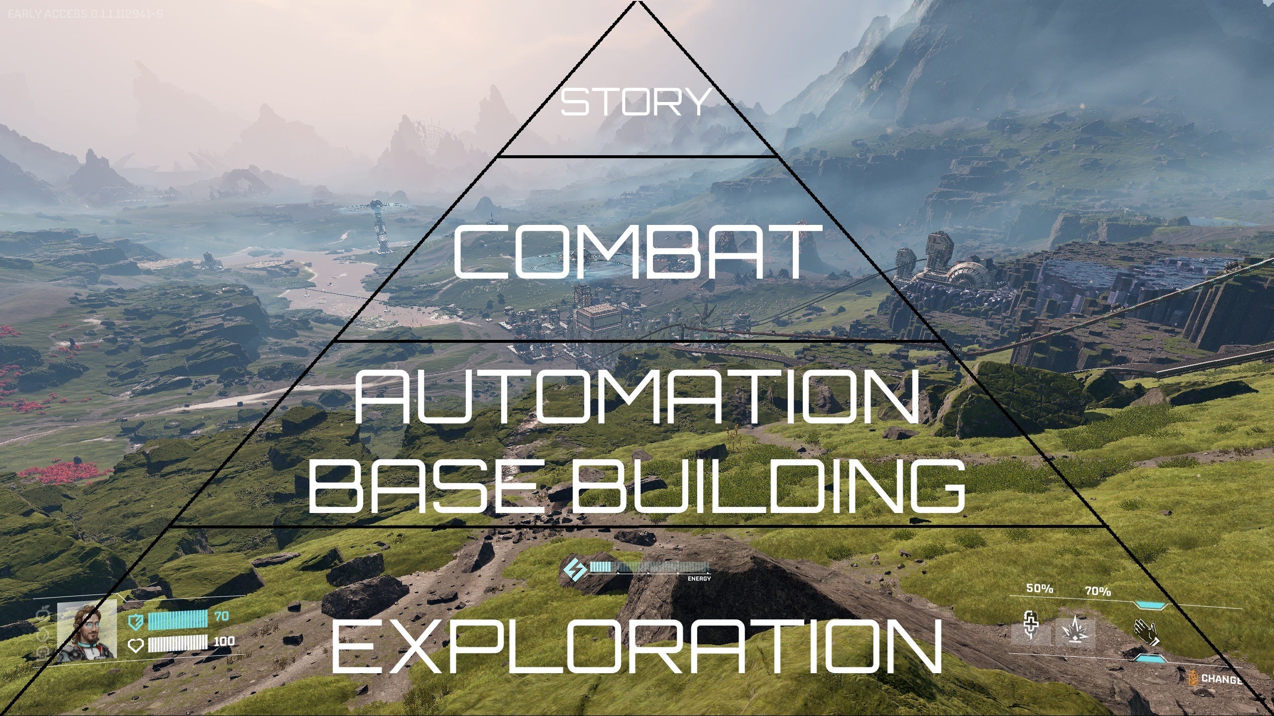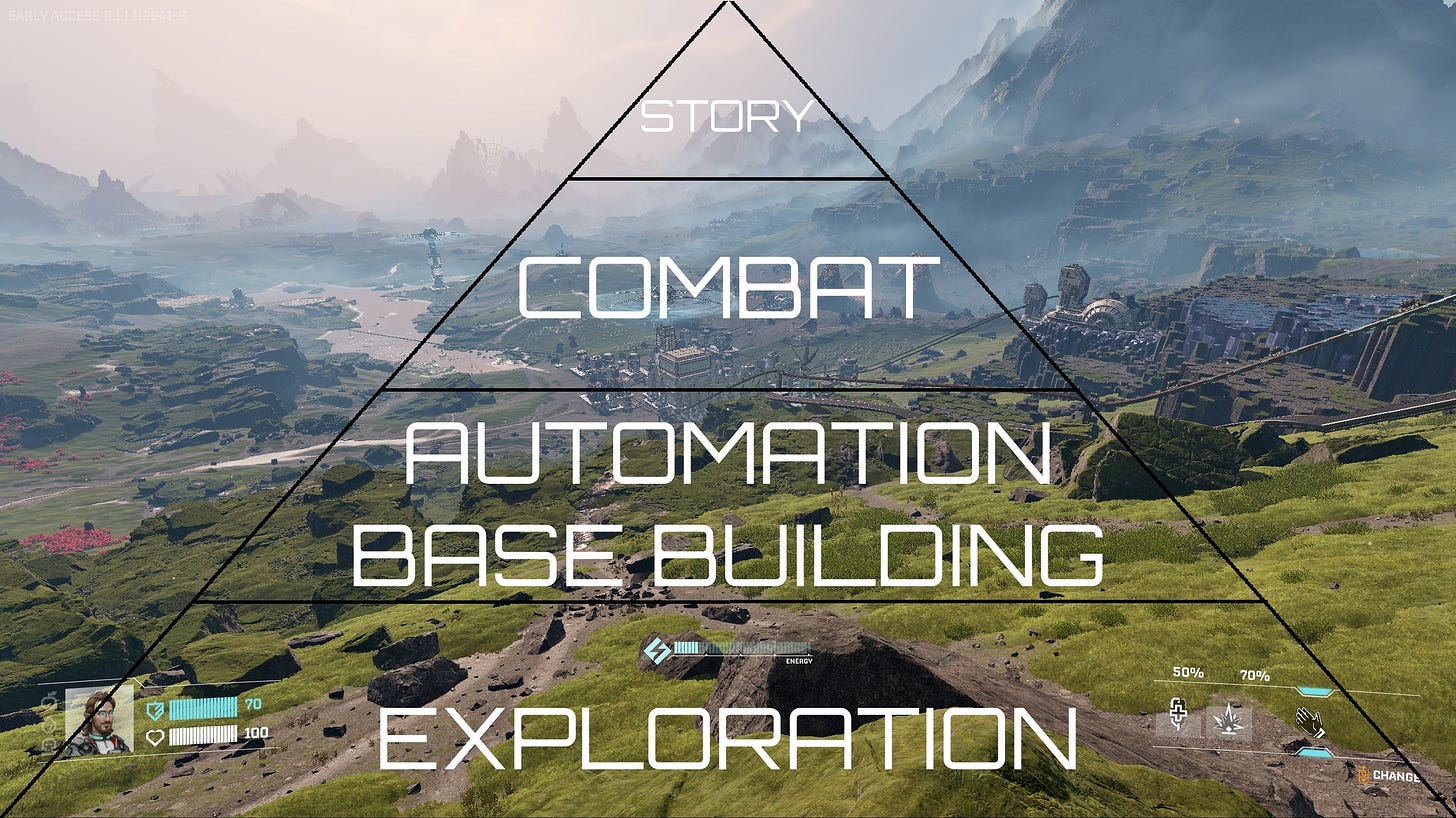 At the base of the pyramid, exploration keeps everything alive. But that exploration only exists because there is a purpose to it: to collect resources that improve your base and further optimize the automation system. To keep that exploration engaging and stressful, you have the top blocks of combat and story, bringing variety to the experience. But these also only work because they directly feed the blocks below them.
